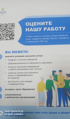 Чтобы оценить УСЛОВИЯ предоставления услуг наведите камеру вашего телефона и сканируйте QR- код. Перейдя по ссылке вы сможете: оценить условия оказания услуг ( -комфорт и санитарно-гигиеническое состояние помещений; -доброжелательность и вежливость работников; -легкость получения информации о работе организации и ее точность; -доступность для инвалидов), а также оставить свое обращение.